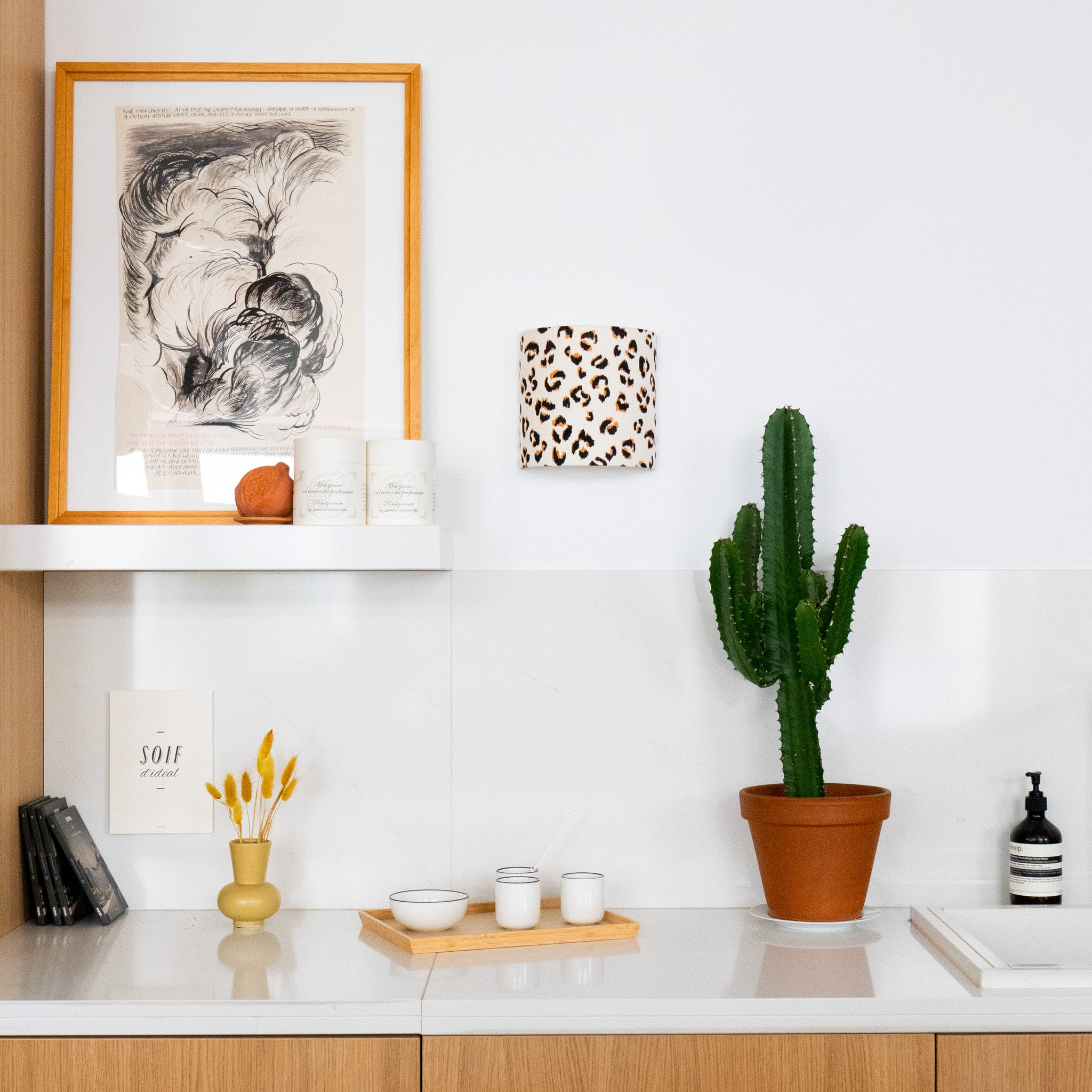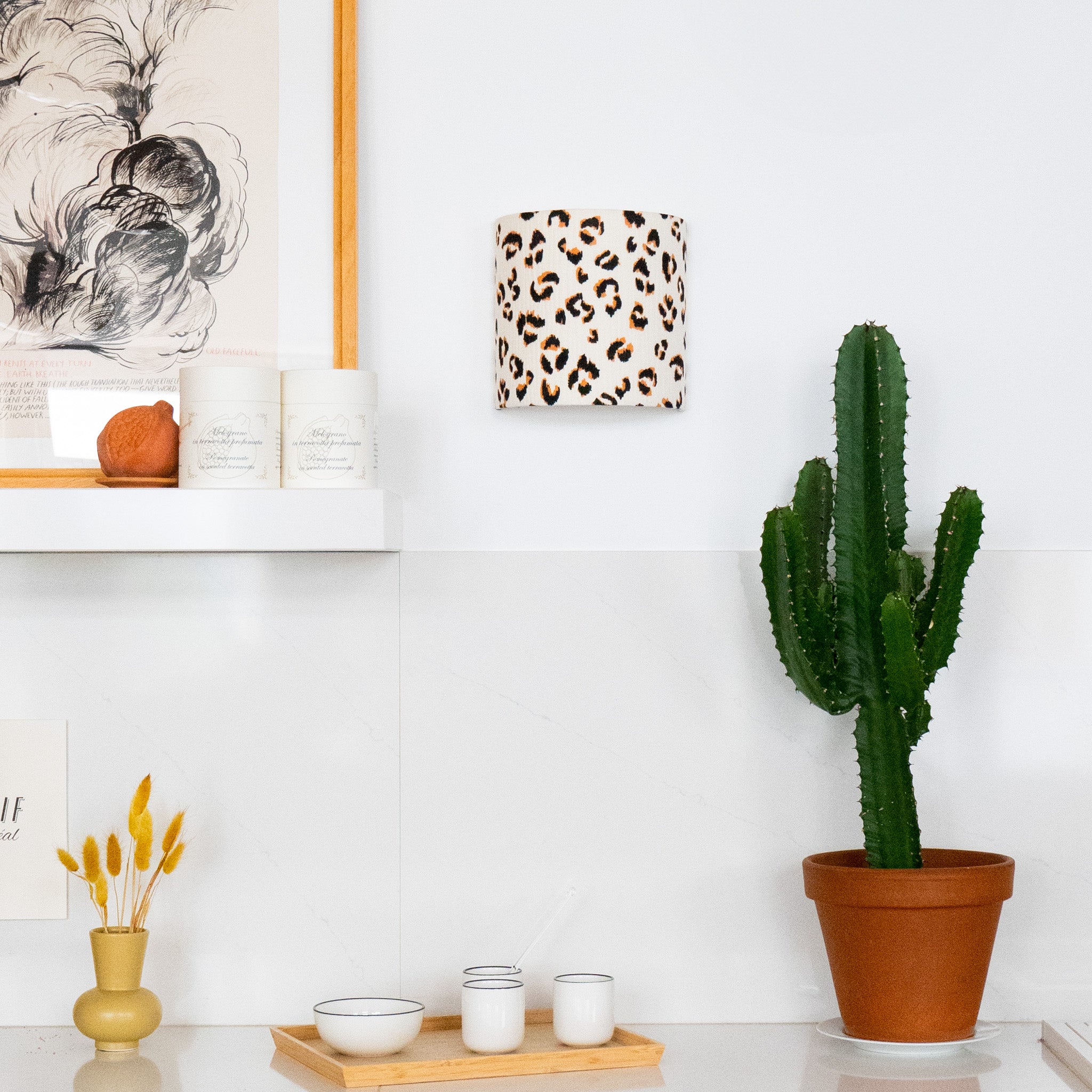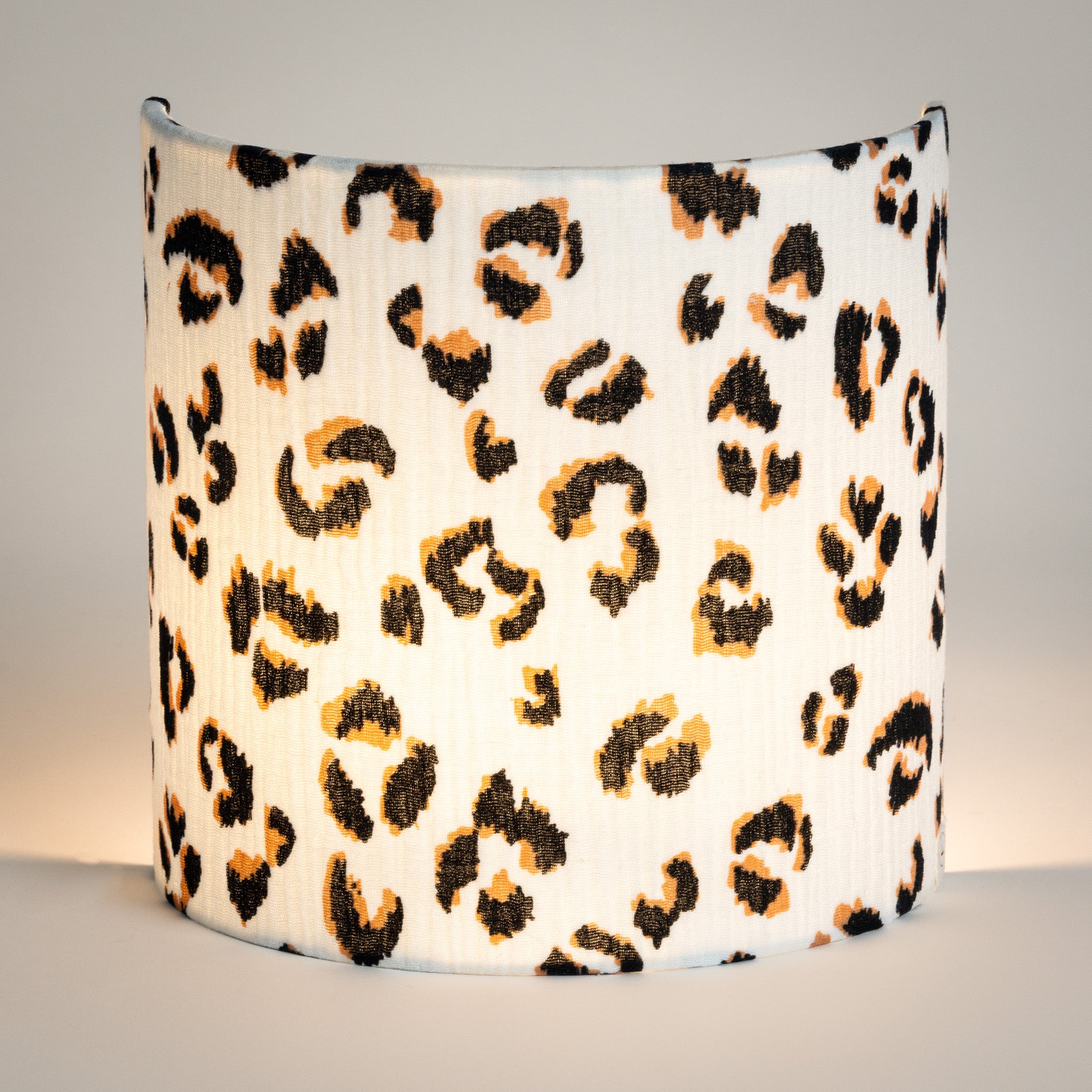 Cet abat-jour pour applique murale est habillé d'une double gaze de coton gaufrée blanc cassé au motif léopard noir et caramel. On adore l’allure audacieuse de cette gamme, où l’imprimé sauvage se mêle à la douceur du tissu texturé pour un effet à la fois sophistiqué et naturel.