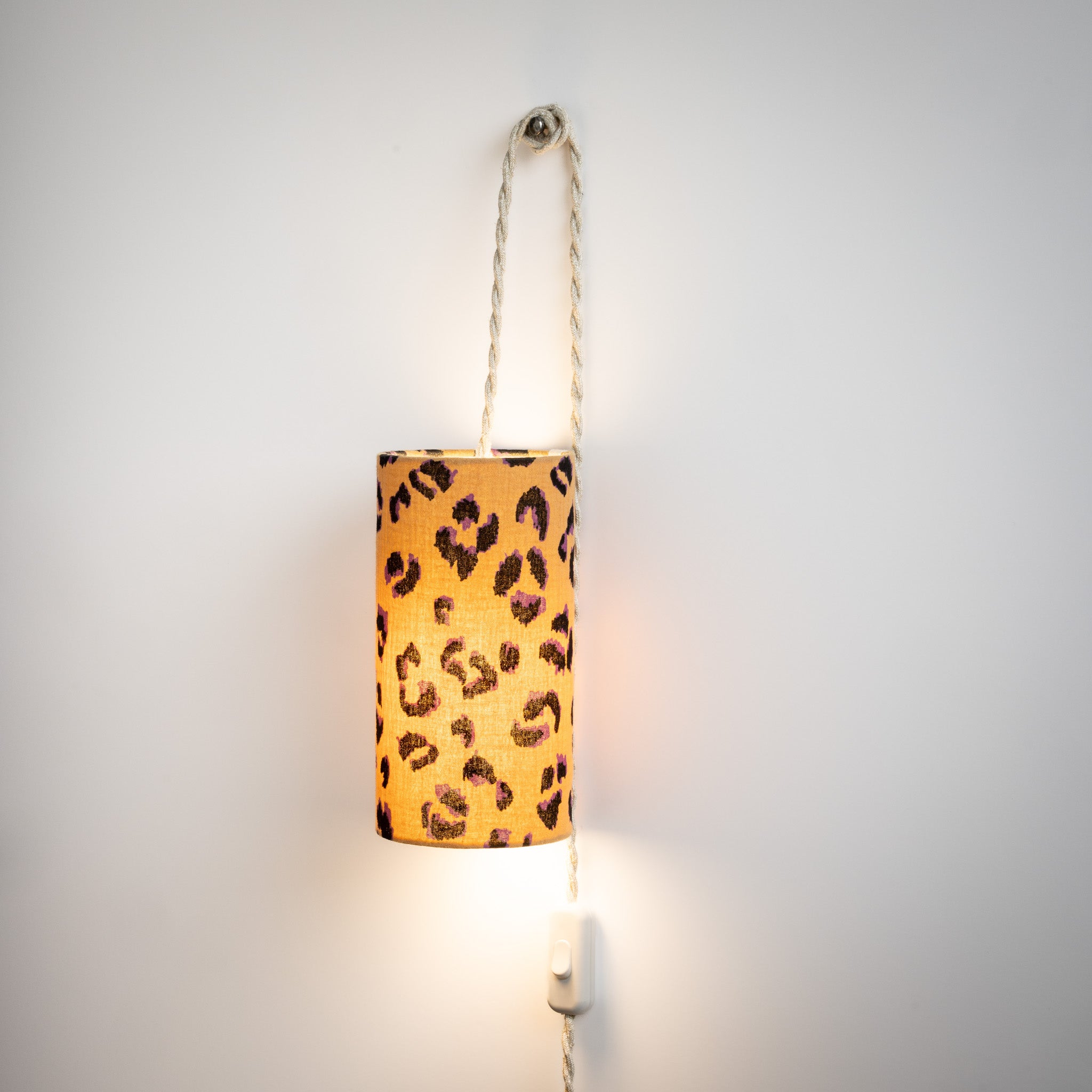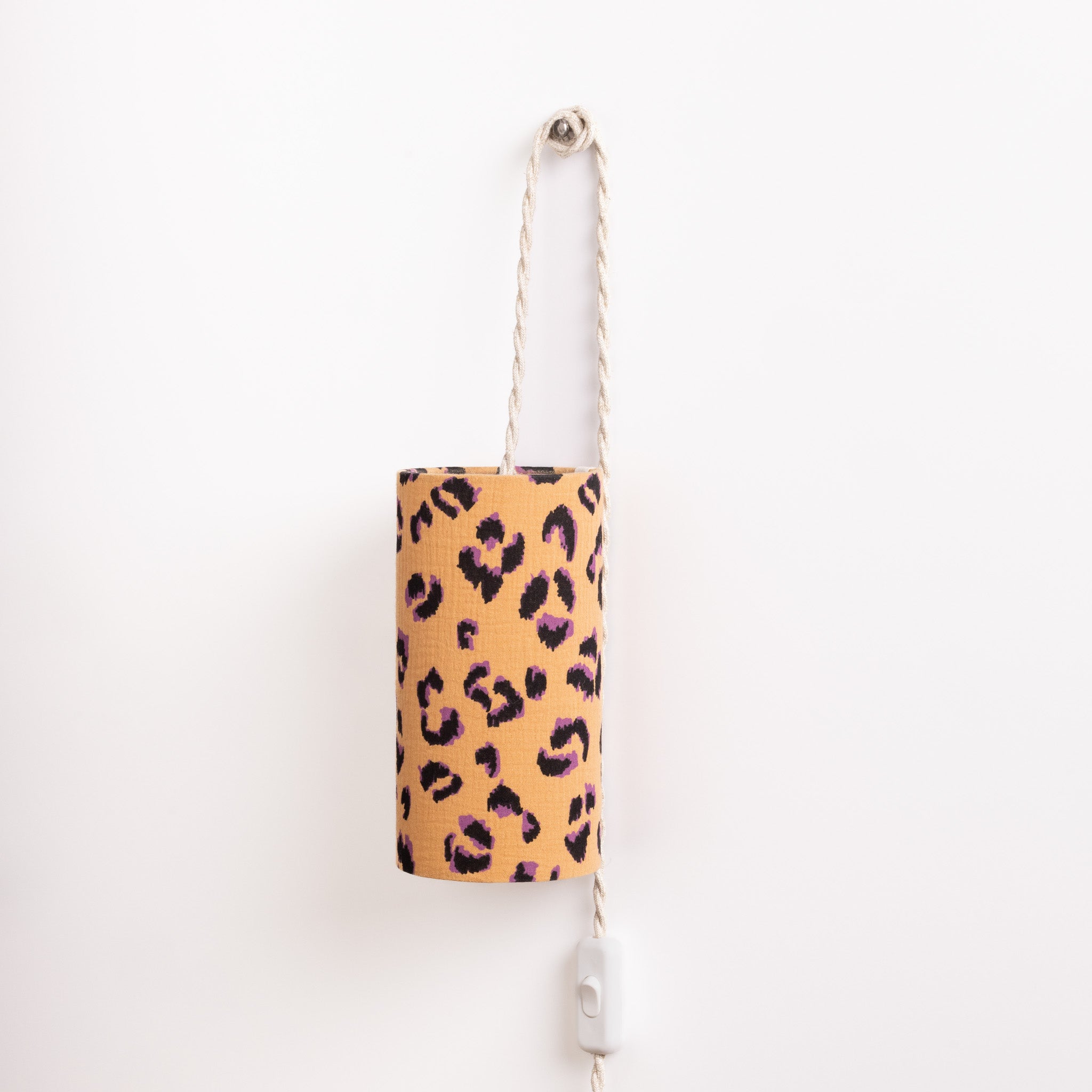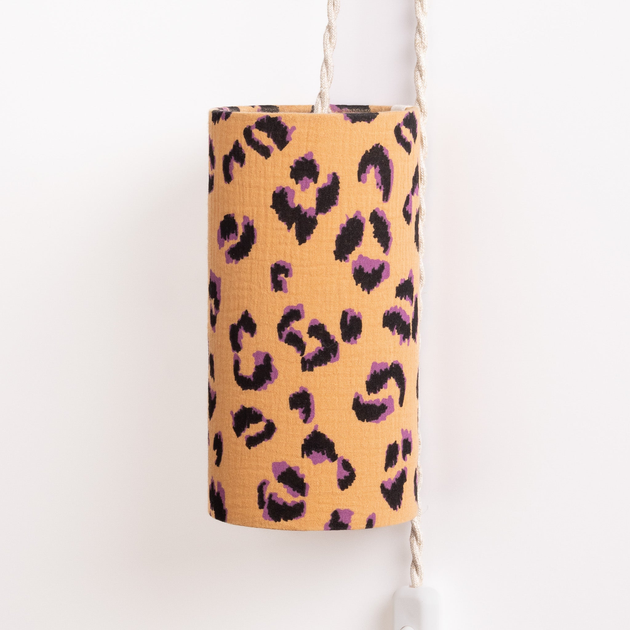 Cette lampe nomade se suspend n'importe où, pour un éclairage d'appoint là où vous en avez besoin : en chevet près du lit, à côté du bureau ou du canapé... Elle est habillée d'une double gaze de coton gaufrée brun ocre au motif léopard noir et mauve. On adore l’allure audacieuse de cette gamme, où l’imprimé sauvage se mêle à la douceur du tissu texturé pour un effet à la fois sophistiqué et naturel.