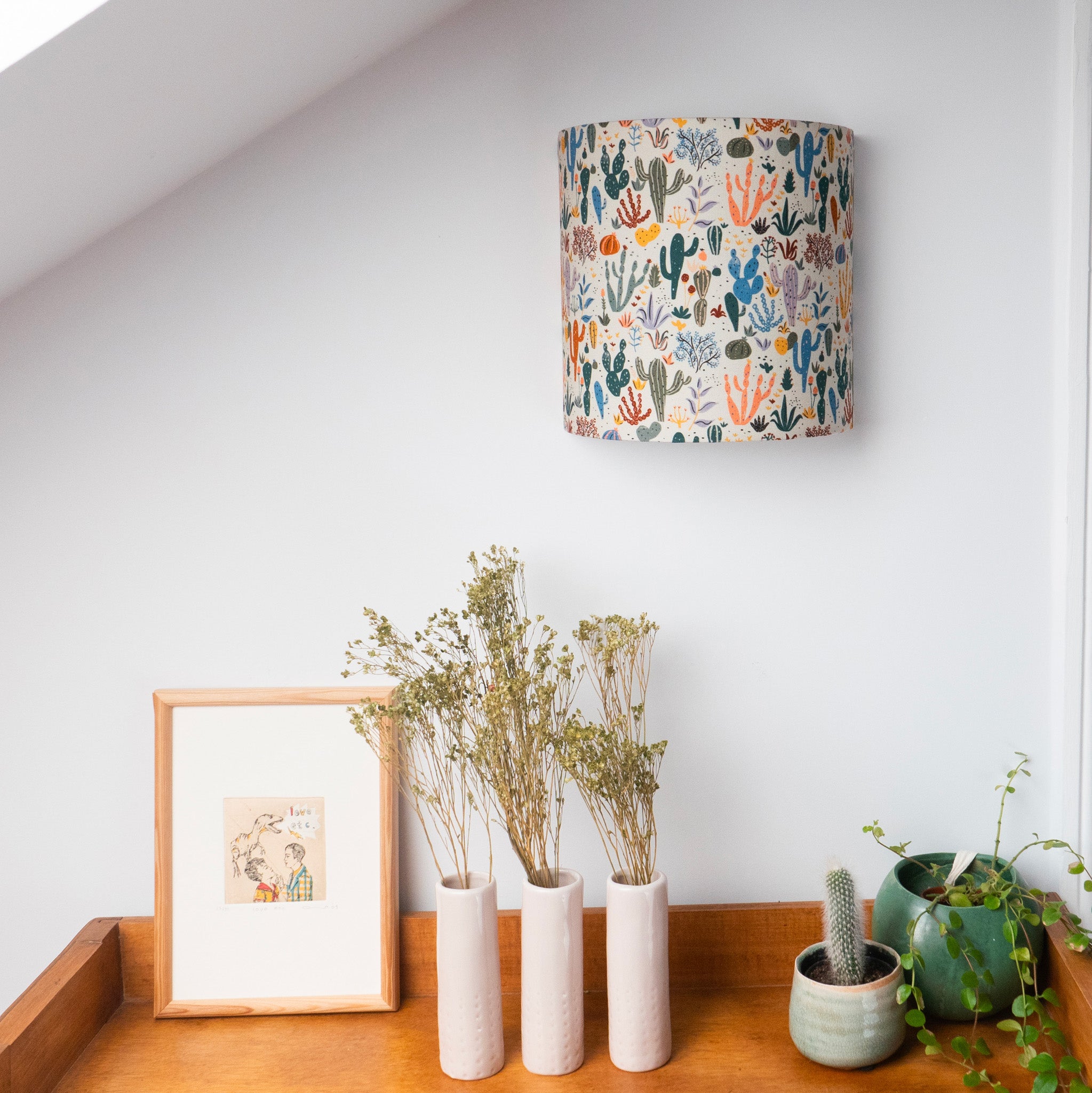 Cet abat-jour pour applique est revêtu d'un coton bio imprimé de cactus dans des couleurs pop sur fond gris clair. Un modèle irrésistible pour petits et grands.