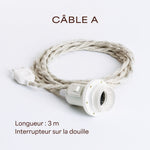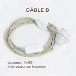 Notre baladeuse est munie d'un câble à brancher, en lin torsadé. Vous avez le choix entre les deux modèles présentés en photo : CABLE A (longueur 3 mètres, avec l'interrupteur sur la douille), ou CABLE B (longueur 1.8 mètre avec l'interrupteur sur le cordon, à 1 mètre de la douille).